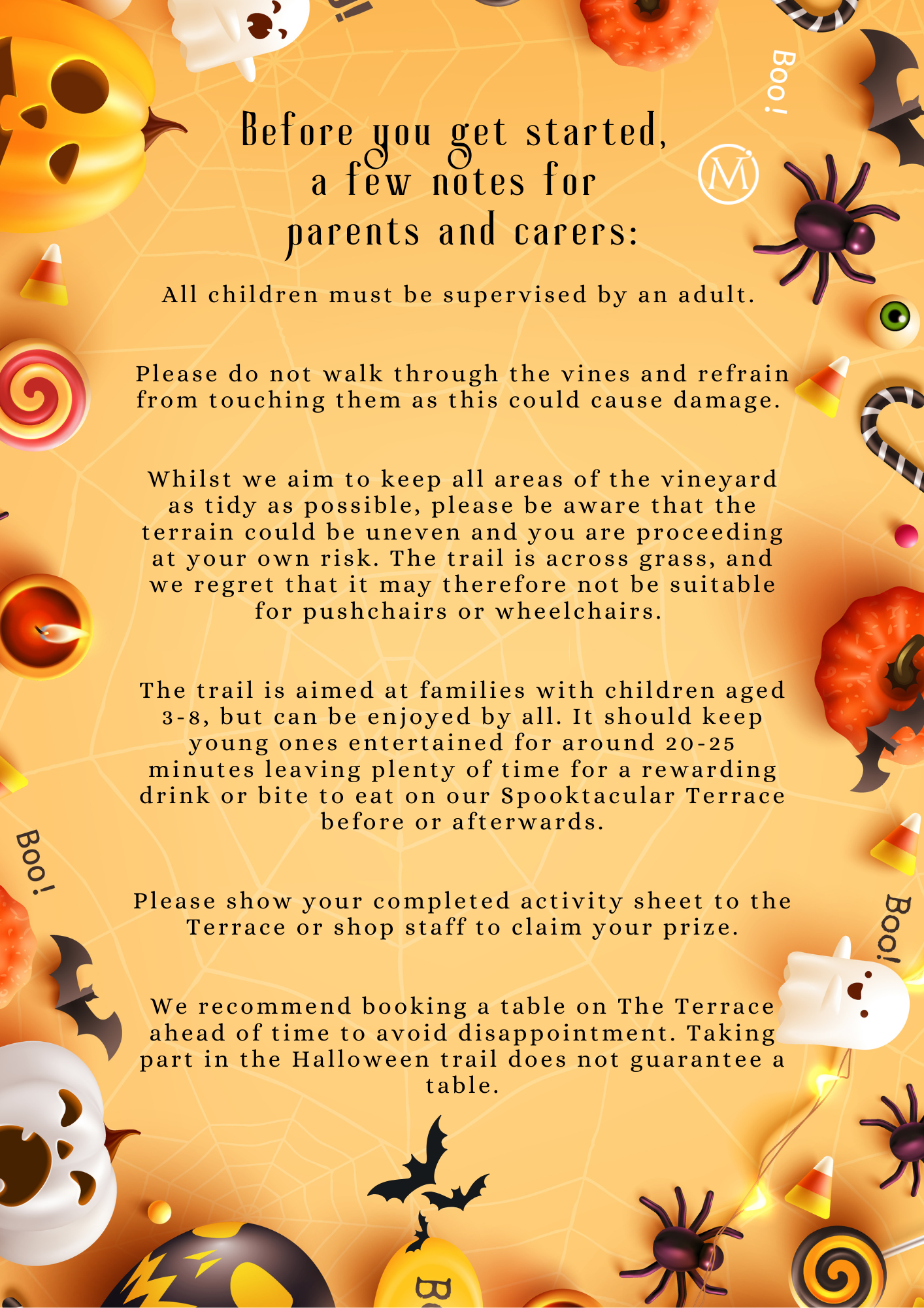 For the very first time, all treasure hunters are invited to join us for a spooky dining experience before or after your trail adventure on our specially decorated Oak Terrace. Here, mini guests can indulge in our menu of a Margherita pizza, Taywell ice cream and an apple juice for £17.95/pp. Please note this menu is only available on our Oak Terrace (not in our Courtyard Restaurant or on the Wine Deck) between Wednesday 22nd & Friday 24th October and between Wednesday 29th & Friday 31st October; from midday until 5pm. Please pre-book your table online ensuring to quote “Spooky” in the notes to be seated in this spooktacular setting. Walk-ins will be available on a first come first served basis. We highly recommend booking online to avoid disappointment.